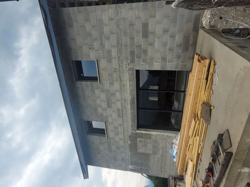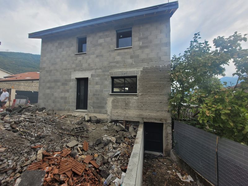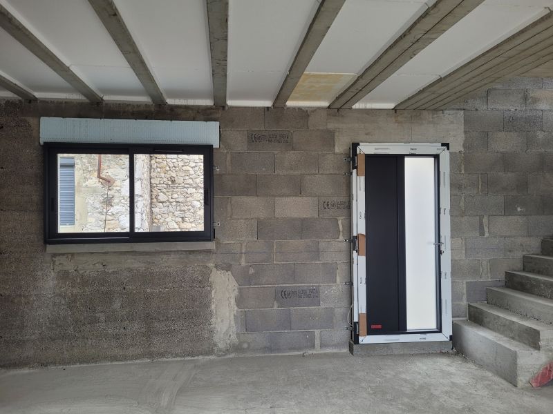 Pose en Neuf de châssis PVC KOMMERLING et 2 coulissants aluminium gamme SCHÜCO dans une maison sur Noyarey, volets roulants dans coffre maçonnerie gamme Combirol motorisation radio somfy iO Rs100 le tout en coloris Gris Anthracite ral 7016.