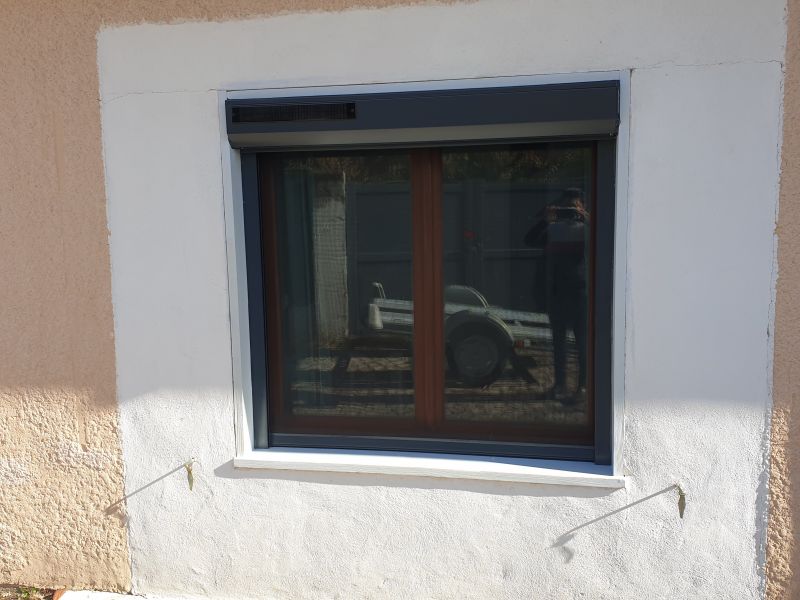 Pose dans une maison sur VIF de volets roulants rénovation motorisés solaire Somfy RTS, caisson forme à Pan coupé, coloris gris anthracite, moustiquaires intégrées dans caisson.
