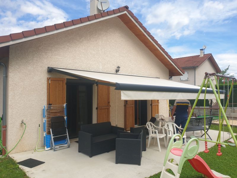 Pose d'un store banne terrasse motorisation Somfy IO avec capteur de vent automatique, toile Dickson Orchestra, armature et coffre coloris Gris Anthracite.