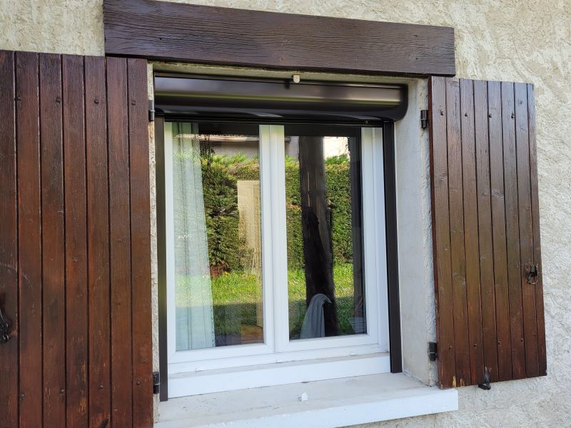 Rénovation de fenêtres + portes fenêtres d'une maison sur la commune de SEYSSINS en gamme PVC KOMMERLING Coloris Blanc double vitrage renforcer 6/18/4 +argon ainsi que volets roulants rénovation motorisation radio somfy iO coloris Brun ral8019.